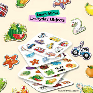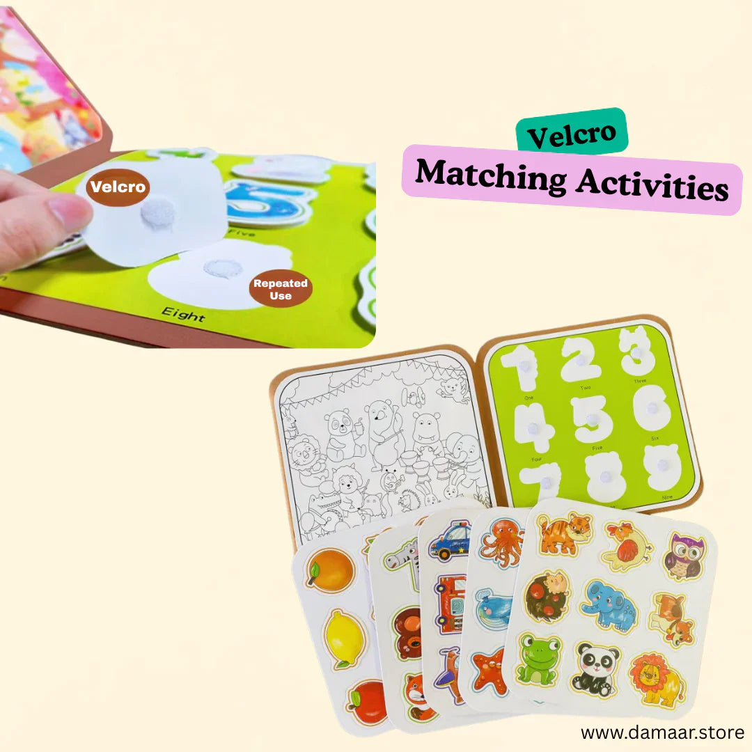 The book includes Velcro-based matching pages where children can stick and unstick items while learning about numbers, animals, fruits, transport and more.