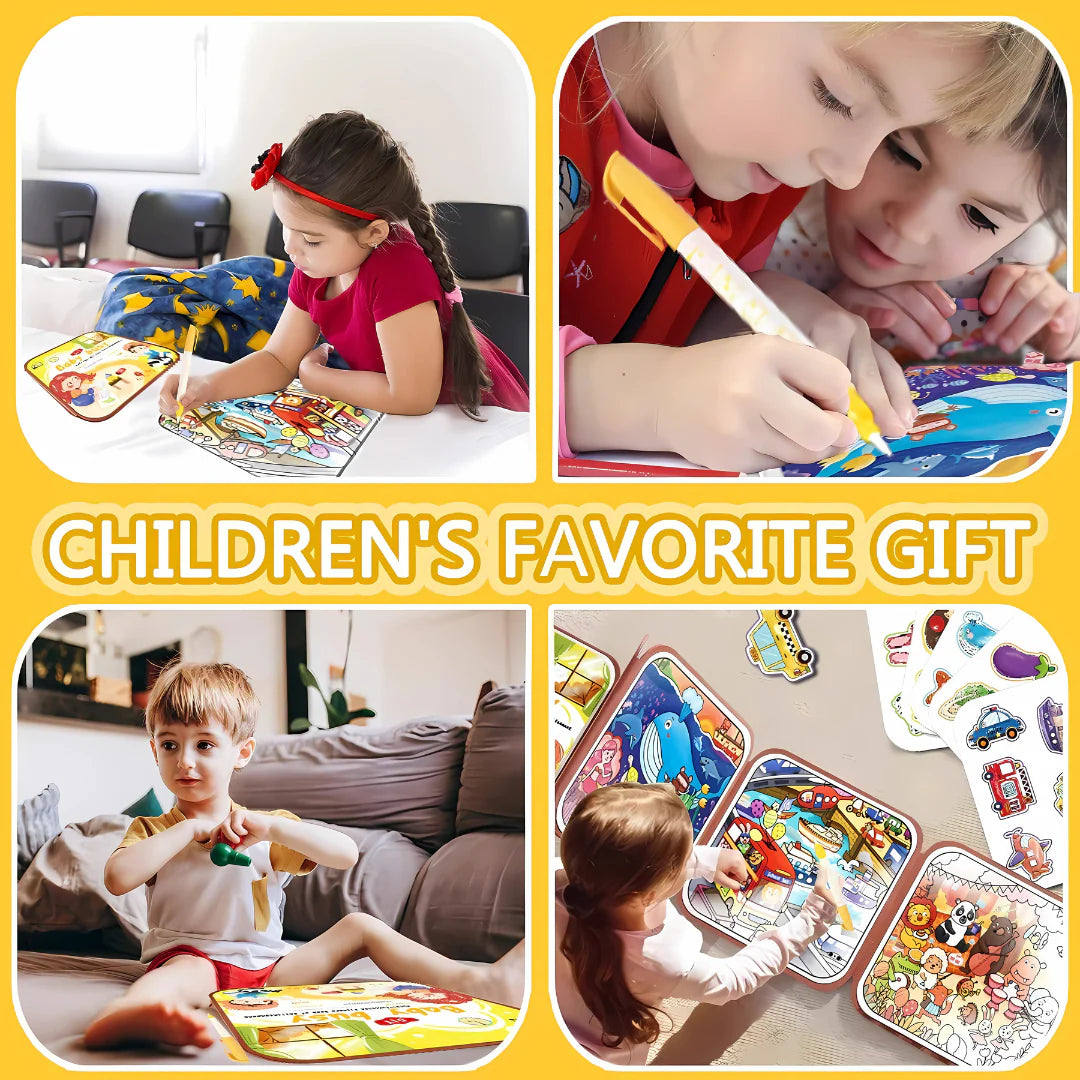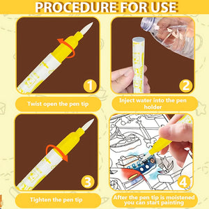 It comes with a water-pen—just fill it up, brush it on the pages, and watch hidden colors magically appear. As the water dries, the colors fade, allowing kids to enjoy the activity again and again—making it a fun, reusable art experience!